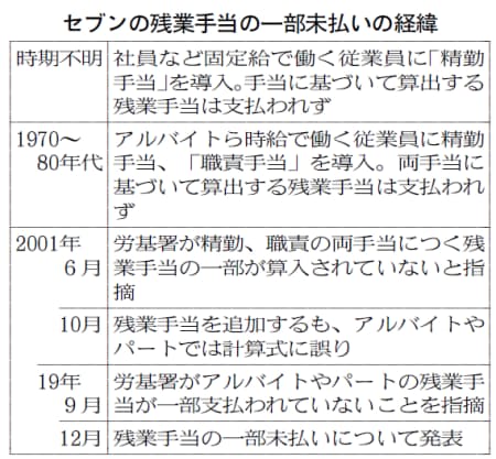 セブン―イレブン・ジャパンは10日、加盟店で働くアルバイトやパート従業員の残業手当の一部が支払われていなかったと発表した。遡って調べたところ、1970年代から払っていなかった可能性がある。永松文彦社長は同日の記者会見で「非常に大きな問題。深く反省したい」と述べた。スマートフォン決済「セブンペイ」のサービス終了や本部社員によるおでんの無断発注など問題が相次ぐなか、加盟店の不信感は高まっている。
