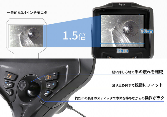 カメラ解像度:100万画素(φ3.9mm、φ6.0mmモデル)、16万画素(φ2.2mm、φ2.8mmモデル)