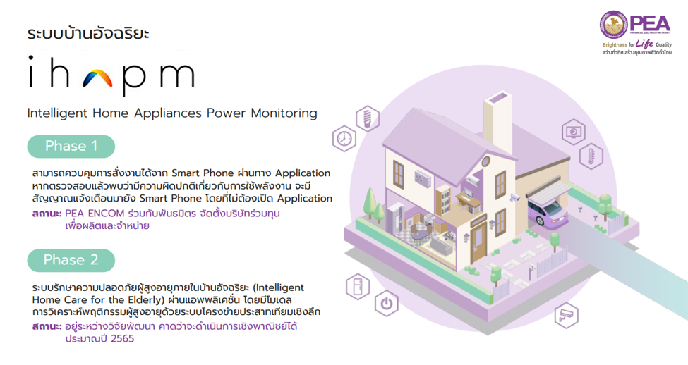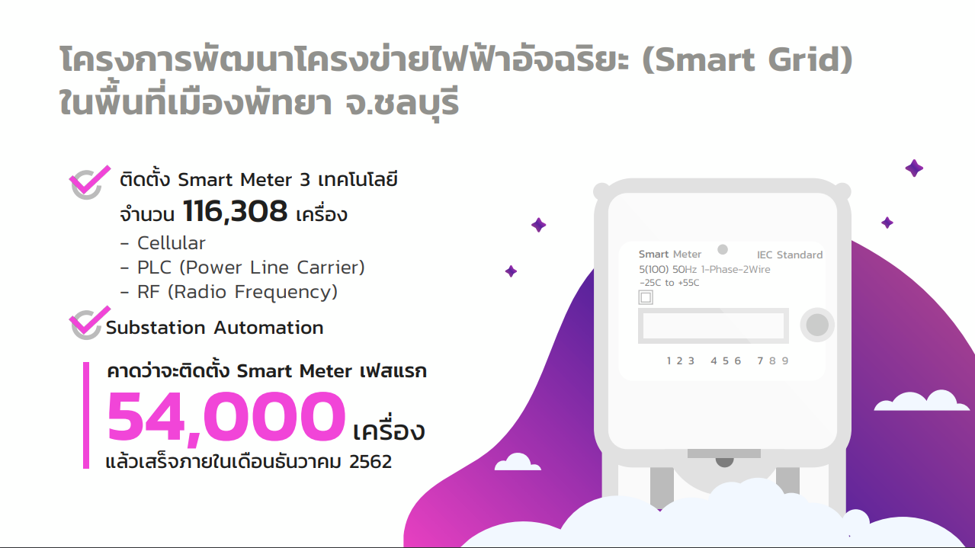 นอกจากนี้ยังมีโครงการที่เริ่มดำเนินการไปแล้วอย่าง โครงการพัฒนาโครงข่ายไฟฟ้าอัจฉริยะ (Smart Grid) ในพื้นที่เมืองพัทยา จ.ชลบุรี ที่ดำเนินการติดตั้ง Smart Meter ซึ่งเป็นส่วนหนึ่งของโครงการ Smart Grid ที่พัฒนาจากมิเตอร์ไฟฟ้าแบบจานหมุนปกติ มาเป็น Smart Meter เปรียบเสมือนคอมพิวเตอร์ขนาดเล็ก ซึ่งนอกจากทำหน้าที่ในการวัดปริมาณการใช้ไฟฟ้าแล้ว ยังสามารถควบคุมและสั่งการผ่านตัว Smart Meter ได้ เนื่องจากศูนย์ควบคุมของ PEA จะสามารถตรวจสอบพฤติกรรมการใช้ไฟได้อย่างเป็นรูปธรรม และจะนำไปสู่นโยบายการประหยัดพลังงานและควบคุมการใช้พลังงานได้อย่างมีประสิทธิภาพ ซึ่งดำเนินการติดตั้งไปแล้วกว่า 1.1 แสนเครื่อง ยังไม่รวมถึงโครงการ 1 ตําบล 1 ช่างไฟฟ้า, โครงการ PEA ส่งเสริมพลังงานทดแทนเพื่อวิสาหกิจชุมชน, โครงการสนับสนุนครุภัณฑ์ทางการแพทย์ให้กับโรงพยาบาลจังหวัด 77 แห่ง และโครงการพัฒนาระบบไฟฟ้าในพื้นที่อุตสาหกรรม EEC เพื่อยกระดับมาตรฐานด้านคุณภาพไฟฟ้าและการให้บริการสำหรับนิคมอุตสาหกรรม ฯลฯ