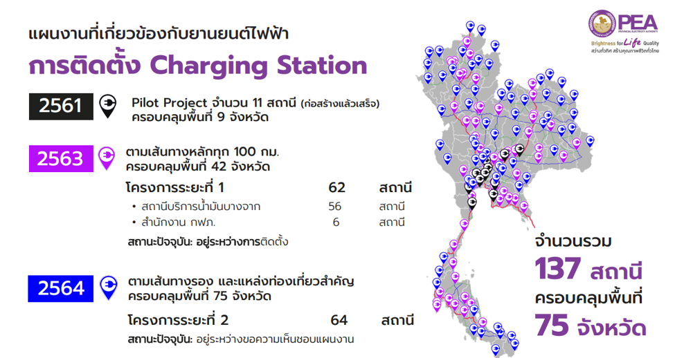 เป็นการติดตั้ง Charging Station หรือสถานีชาร์จไฟสำหรับ EV Car แบบ Quick Charge เพื่อรอบรับเทคโนโลยี EV ในรถที่ขับเคลื่อนด้วยพลังงานไฟฟ้าแบบชาร์จไฟ ที่จะมีผู้ใช้งานมากขึ้นในอนาคต ปัจจุบันติดตั้งแล้วเสร็จกว่า 11 สถานี ใน 9 จังหวัด และมีเป้าหมายจะติดตั้งให้ครบ 137 สถานี ครอบคลุมพื้นที่ 75 จังหวัด ภายในปี 2564 และพัฒนาแอปพลิเคชัน PEA VOLTA เพื่ออำนวยความสะดวกให้กับผู้ขับขี่ยานยนต์ไฟฟ้า สำหรับใช้บริการ Charging Station