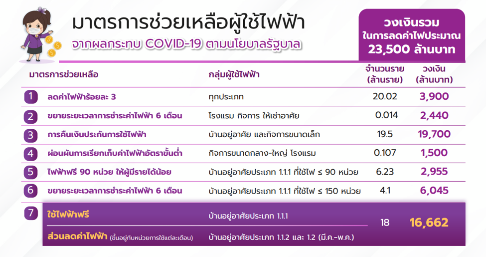 ในปี 2563 PEA มีโครงการหลักในการช่วยเหลือผู้ใช้ไฟฟ้าจากผลกระทบ COVID-19 ตามนโยบายรัฐบาลแล้วว่า 7 มาตรการ ในส่วนของการใช้ไฟฟ้า ไม่ว่าจะเป็น การลดค่าไฟร้อยละ 3, ขยายระยะเวลาการชำระค่าไฟฟ้า 6 เดือน, การคืนเงินประกันการใช้ไฟฟ้า, ผ่อนผันการเรียกเก็บค่าไฟฟ้าอัตราขั้นต่ำ, ไฟฟ้าฟรี 90 หน่วย แก่ผู้มีรายได้น้อย, และส่วนลดค่าไฟฟ้า รวมวงเงินทั้งสิ้นกว่า 2.35 หมื่นล้านบาท