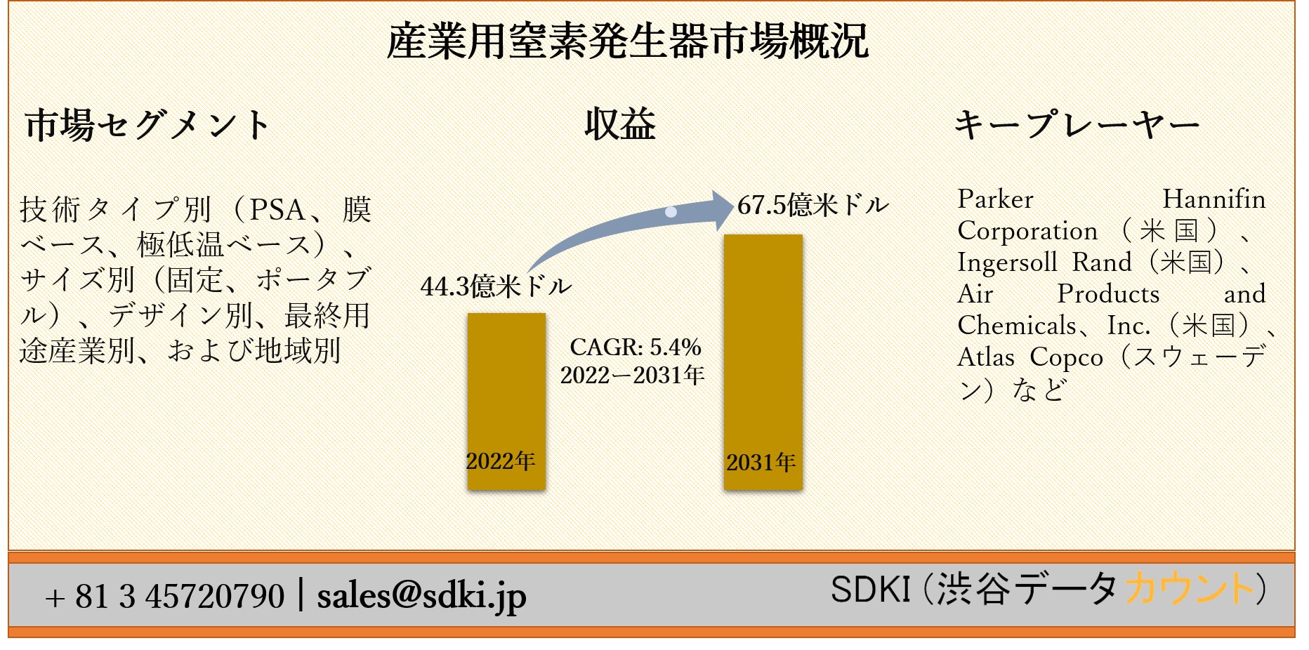 Emergen Researchは市場調査とコンサルティング会社であり、同期配給研究報告、カスタマイズされた研究報告、及びコンサルティングサービスを提供しております。弊社のソリューションは主に、貴社の目的となる、人口統計及び業界全体にわたり消費者行動の変更を特定する、ターゲットすると分析する、貴社の目的に焦点を当てており、顧客がよりスマートなビジネス上の判断をするように支援します。当社は市場情報調査を提供しており、ヘルスケア、タッチポイント、科学物質、タイプ、とエネルギーなど複数の業界にわたる関連性のある事実に基づきの調査を保証する市場情報調査を提供致します。当社は一貫しての研究提供を更新することにより、顧客は市場内の最新 動向について認識あることを確実します。Emergen Researchは様々な専門分野の経験豊富なアナリストの強い基盤があります。当社の業界経験とあらゆる研究課題に対する具体的な解決策を開発する能力は、顧客にそれぞれの競合他社に対する優位性を確実する能力を提供します。詳細については、次のHPをご覧ください