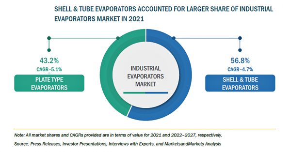 工業用蒸発器の市場規模は、2022年の187億米ドルからCAGR4.8%で成長し、2027年には237億米ドルに達すると予測されています。工業用蒸発器市場は近年著しく成長しており、今後数年間はより高い成長率で推移することが予想されます。これは、ZLD(ゼロ廃水)の採用が進んでいることと、最終用途産業が拡大していることに起因しています。